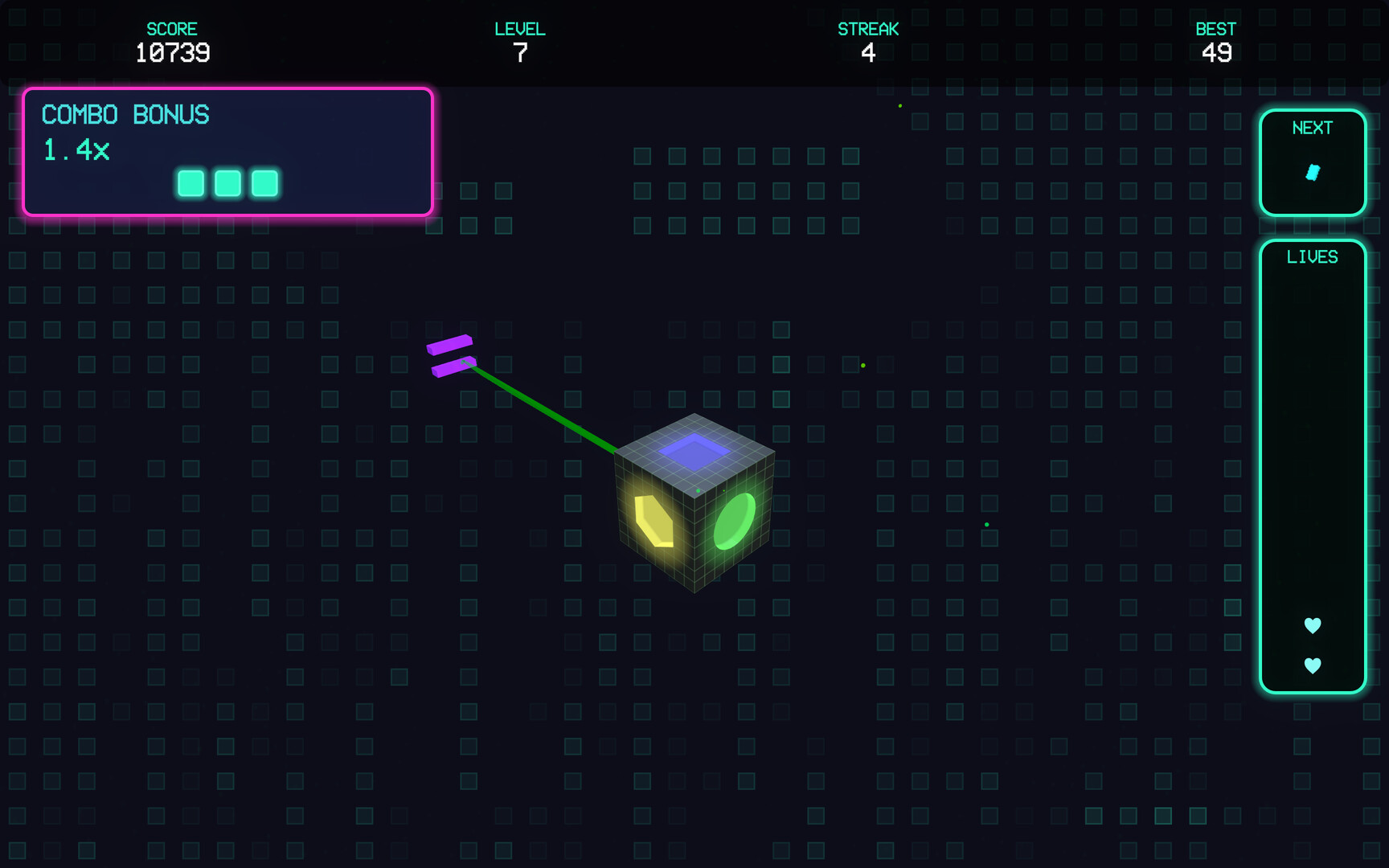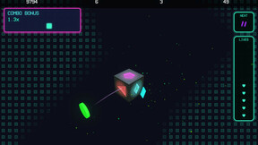 A fast-reaction 3D puzzle game where you rotate a cube to match incoming geometric shapes against a backdrop of neon-soaked vaporwave aesthetics, fizzing laser beams, and pulsing music.