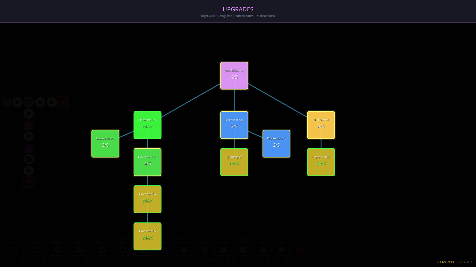 Boost extraction speed, cut processing time, speed up belts, and more. Unlock bonuses like Lucky Extractor (2x random values) and Processor Efficiency (extra outputs). Each path has 5 progressive levels.
