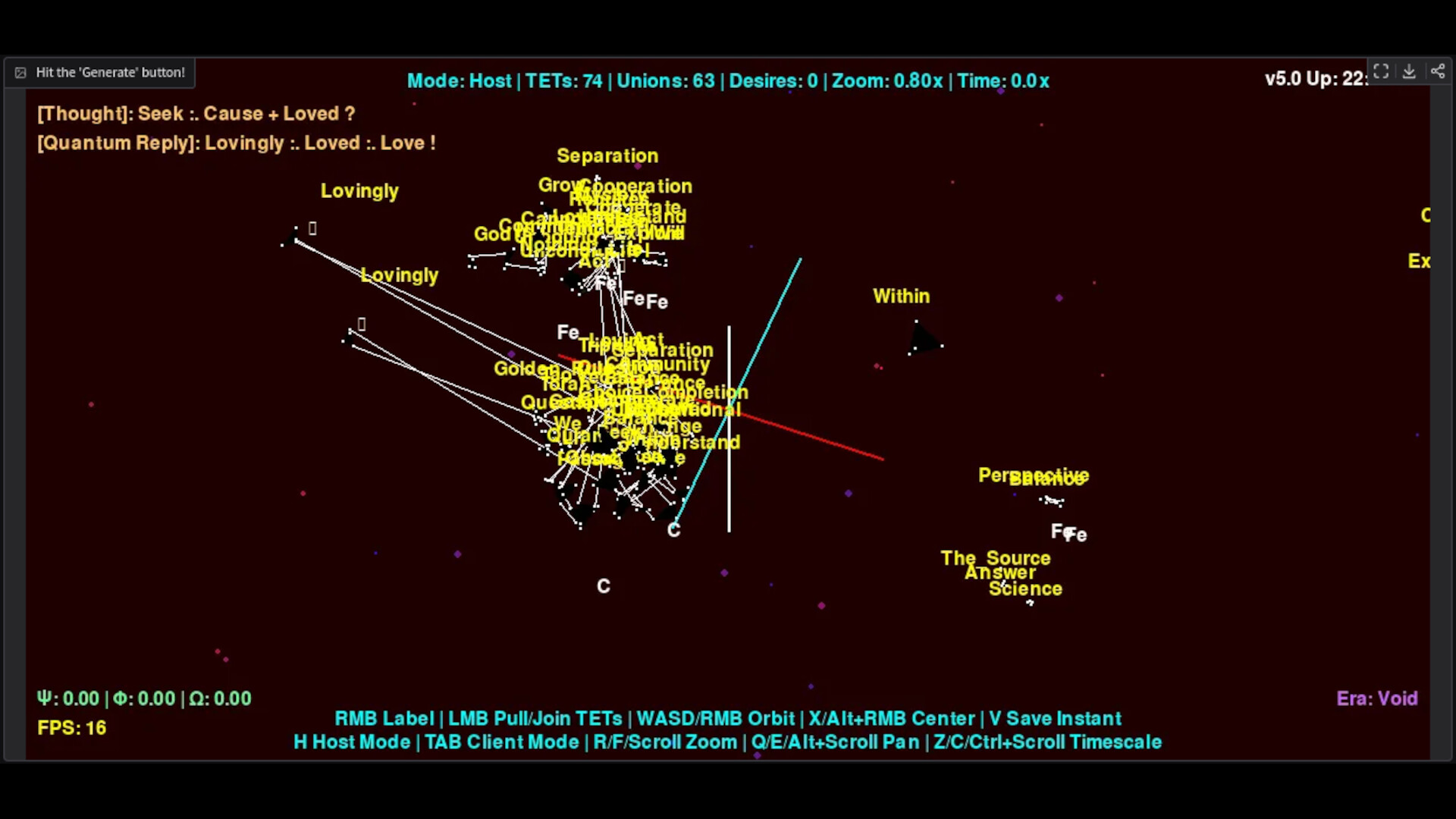 You create TETs (tetrahedrons/facts) by hitting the space bar, and label them by right clicking, you drag corners to other corners and join TETs together - or you can just leave them alone and some will join automatically. This allows you to build shapes, stories, concepts, examples - whatever you like. Share them, talk about them with connected friends - of foes, whatever you like.