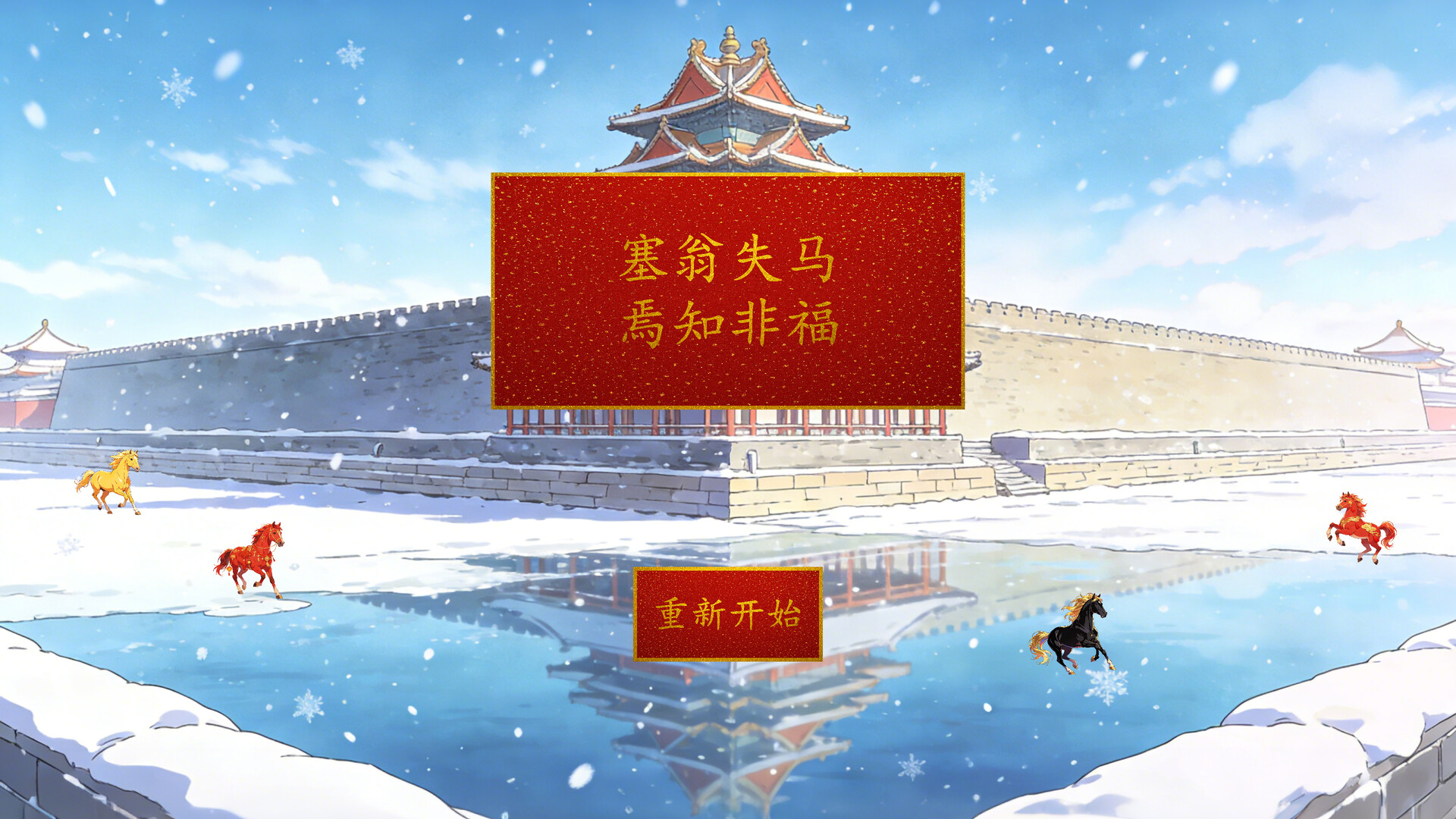 Bole refers to those in Chinese history who excelled at identifying talented horses, and has since come to signify individuals skilled at discovering and nurturing talent. You will play the role of Bole, traveling to major historical sites across China to select the thousand-mile horse of your choice. Even if you fail to find one, it matters not—for there is a well-known Chinese idiom, Sai Weng Shi Ma, Yan Zhi Fei Fu, which means when the old man on the frontier lost his steed, who could tell it was not a blessing in disguise? This idiom means that while a loss may seem unfortunate at first, it may ultimately lead to unexpected benefits.