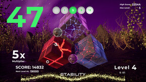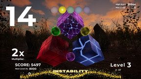 Time is ticking, execute triple color combos to control the game timer. Add seconds to the clock by matching color spheres to the cubes. The cubes will change colors as you execute combos. Matching the correct color to a cube will also replenish the ever diminishing stability gauge. An incorrect color match will deplete stability. If the cube becomes completely unstable, time will collapse at a very fast rate, and you will need to recover stability by matching correct colors as the timers are in free fall. When the timer runs out, its game over!