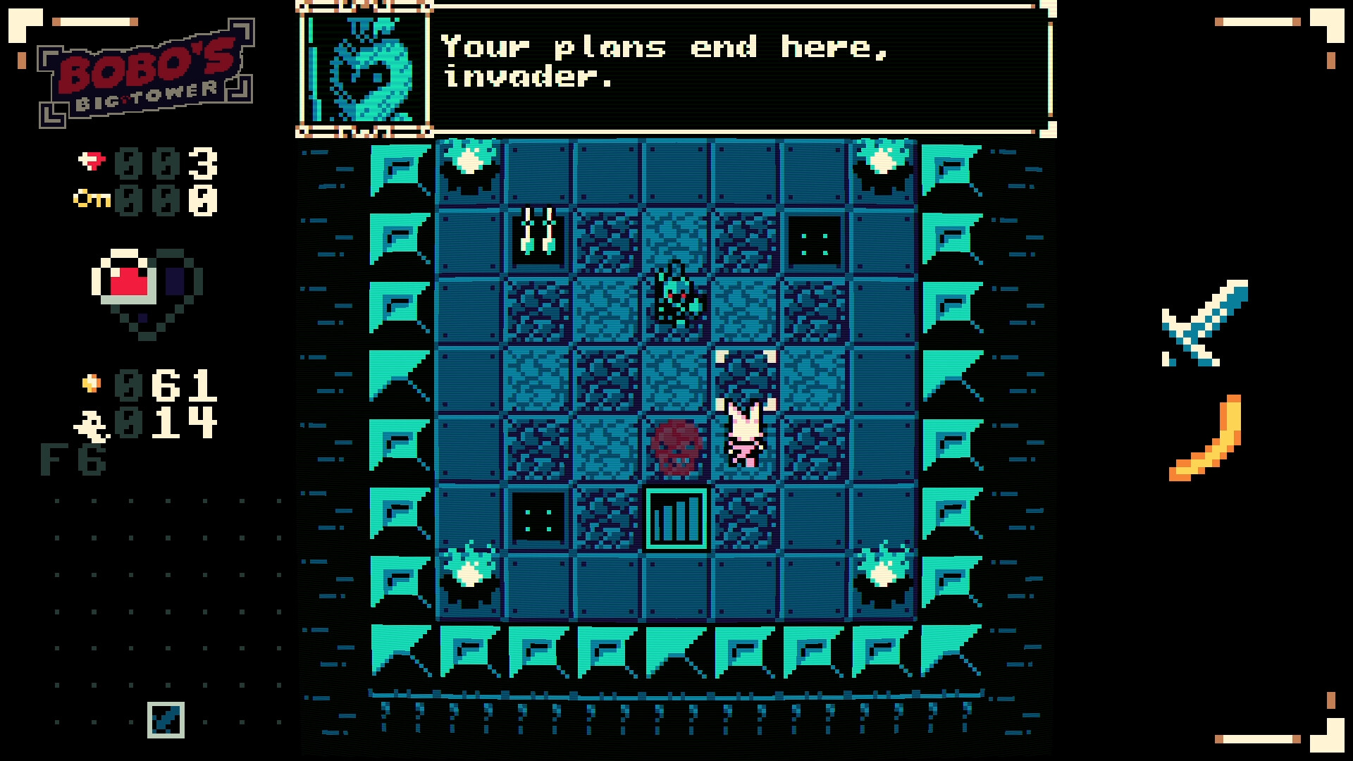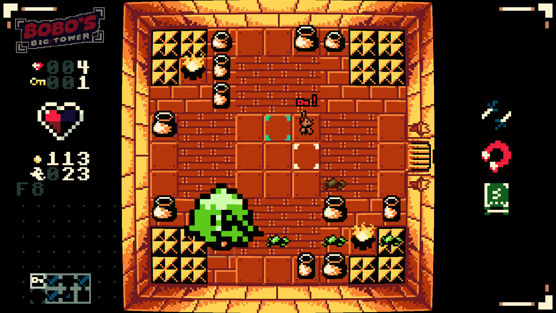 Bobo's Big Tower is an action-puzzle game in a style inspired by the GameBoy Color! Choose from a colorful cast of characters and solve procedurally-generated floors of puzzles to survive the onslaught of Bobo's minions blocking your path! Time only moves when you do, so be sure to strategize critically before each move!