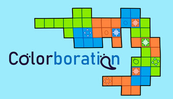 Colorboration is a puzzle game where the path of one character is the wall of another. Each level consists of different coloured characters needing to maneuver around their paths and push boxes so that each character can get to their goal.