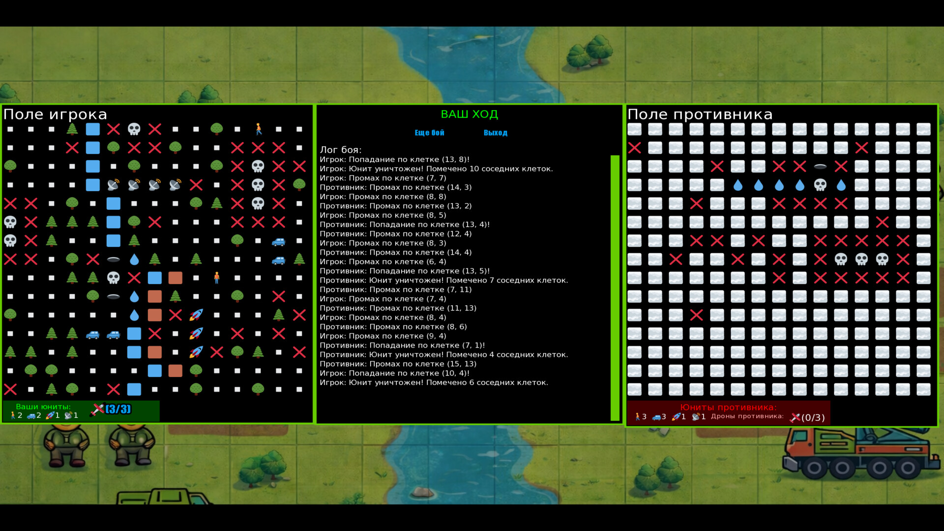 В этой игре вы размещаете своих бойцов на сетке, каждый из которых представляет собой эмодзи. Цель игры — уничтожить эмодзи противника, делая ходы и пытаясь угадать их расположение.