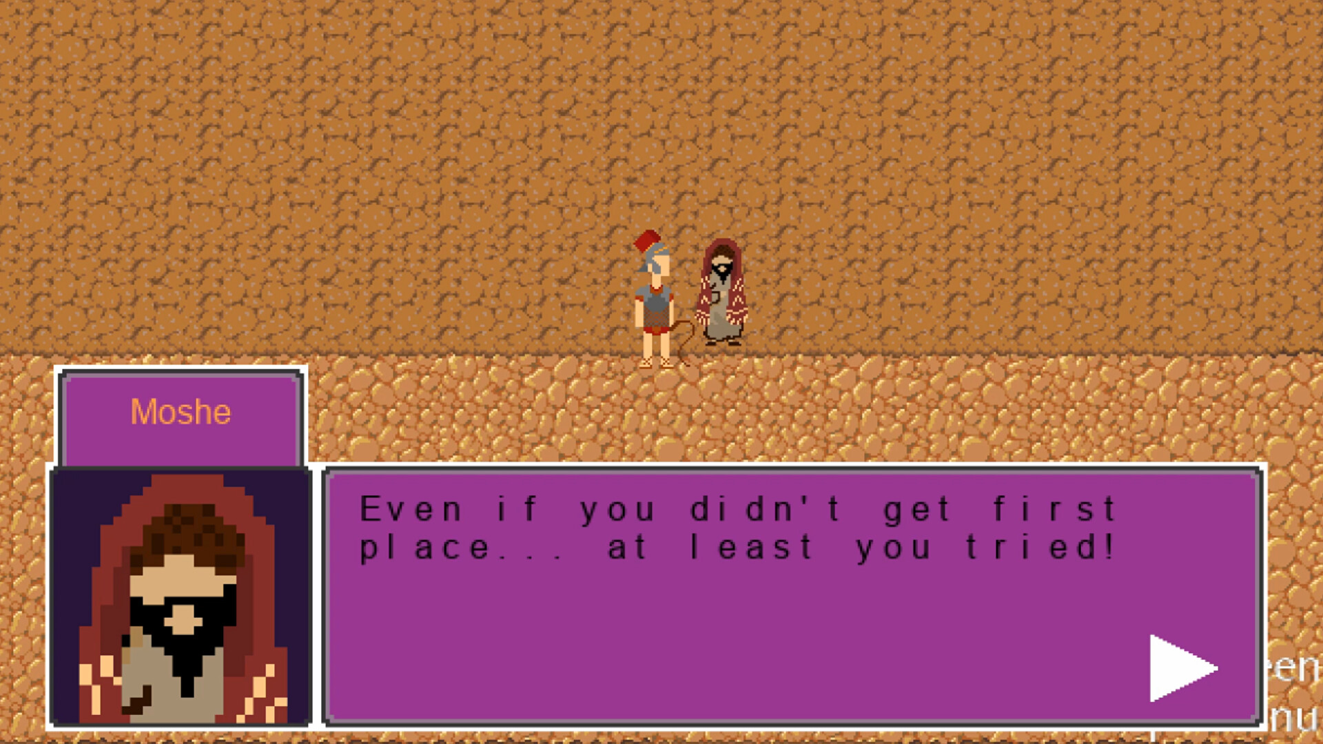 But wait! There's more!!! In between races you can farm the local fields to obtain enough money before you peacefully slumber at night! Talk with encouraging locals that will give you advice that we all need in life! You'll not only meet wonderful middle eastern locals, but you'll encounter a mysterious time traveler hellbent on stopping you from competing against yourself in the final race!