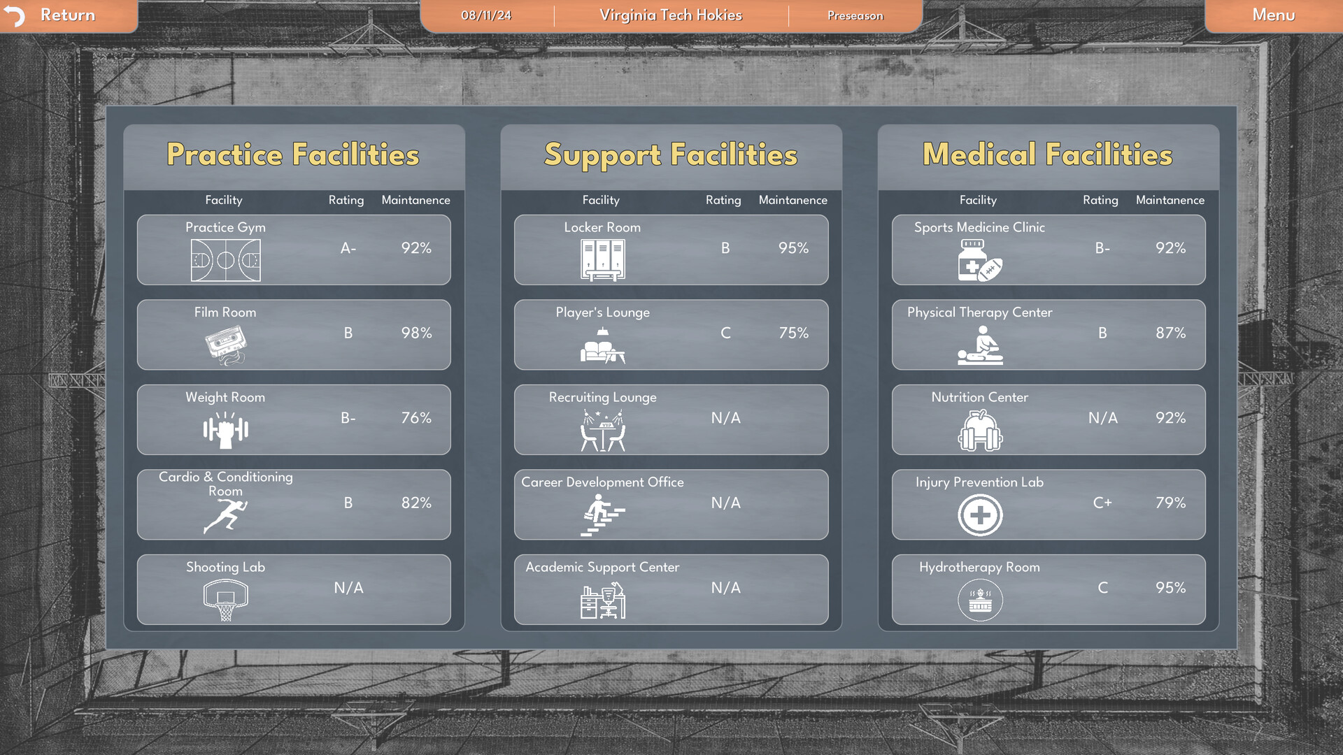 College Basketball Manager introduces an innovative recruiting system with thirteen key "pitches" that represent various aspects of your basketball program. These pitches, such as Feeling Wanted, Playing Time, and Proximity to Home, are graded on an A-F scale, providing an overview of your school's strengths and weaknesses. The recruit's perception of each pitch is pivotal, and their knowledge about your program can be influenced through strategic actions like calls and campus visits. What sets this system apart is your ability to sway recruits on the importance of each pitch, allowing you to strategically shape their preferences and secure their commitment to your program