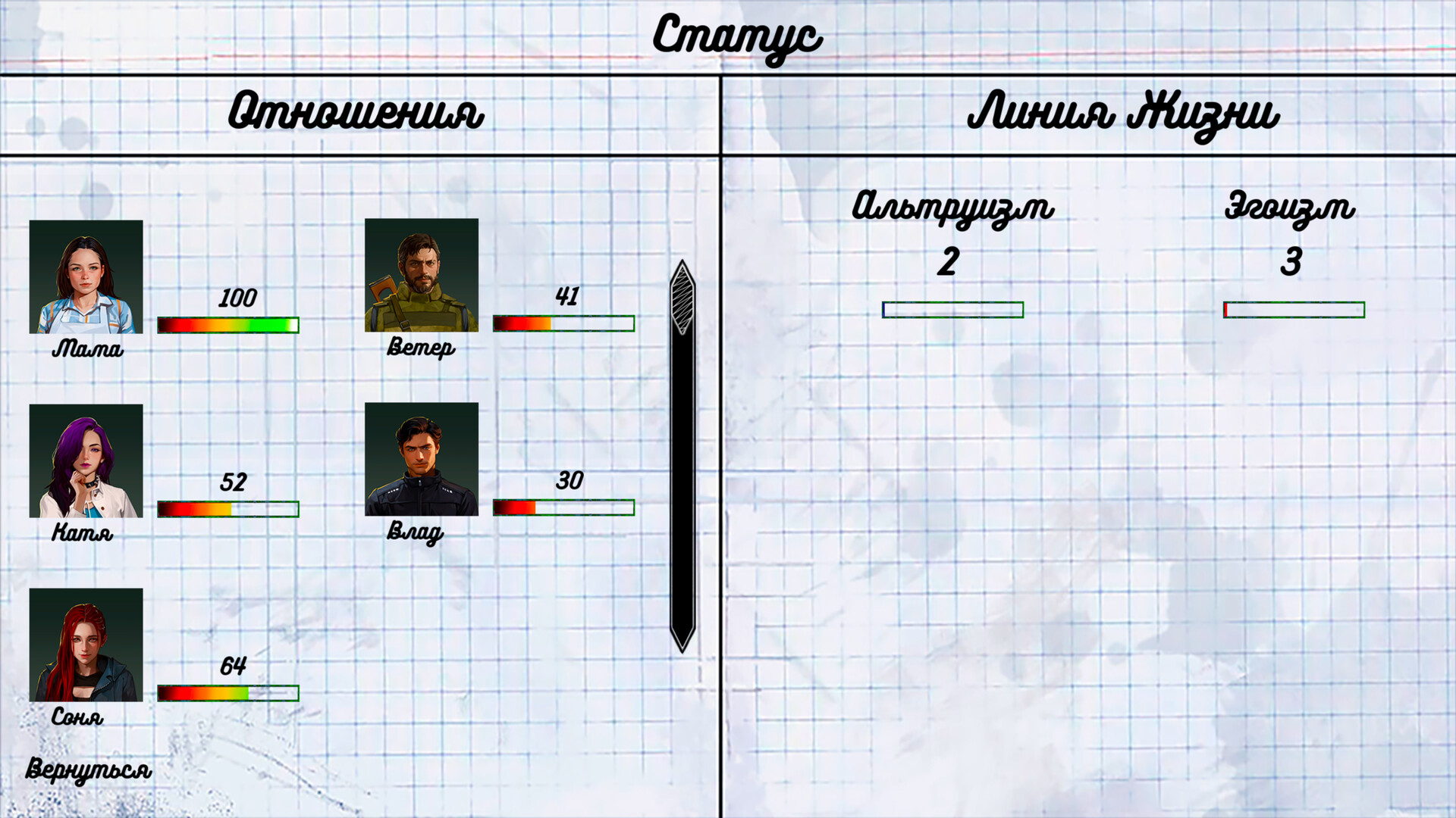 - Вариативность сюжетных выборов, система построения отношений с персонажами и с самой собой.