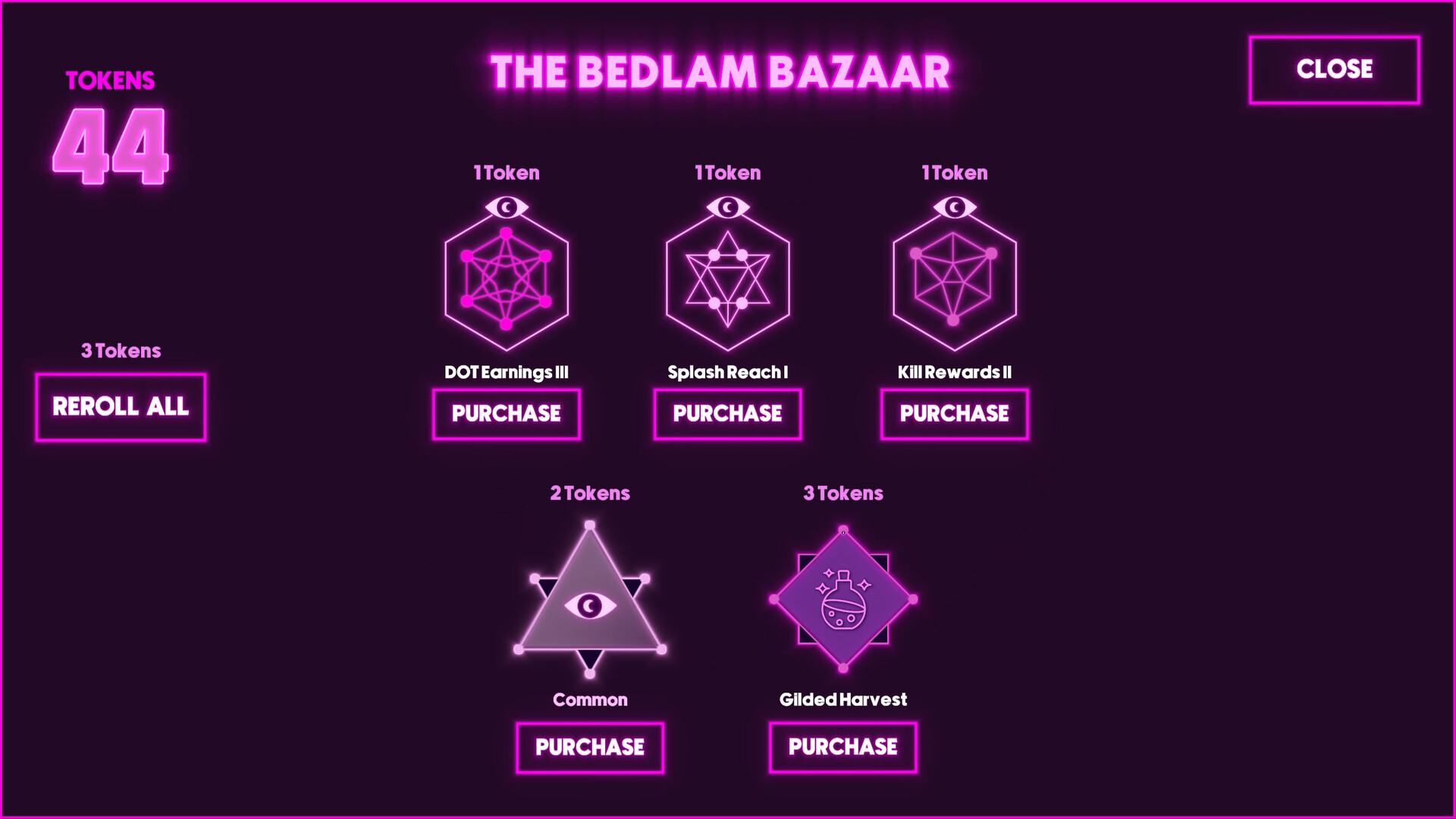 Do what any red-blooded cultist would do. Turn destruction into profit. Spend Tokens in the shop on permanent upgrades, powerful Boons , and special Relics that make each night of devastation more lucrative than the last. Recharge your Relics between runs and watch your power compound like interest on a really evil savings account.